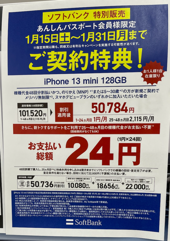 2022年1月の案件として、iPhone13miniが実質24円で販売されております。